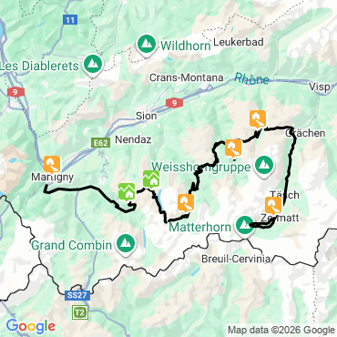 - Dinner in Martigny (day 1) and in Zermatt (day 7).