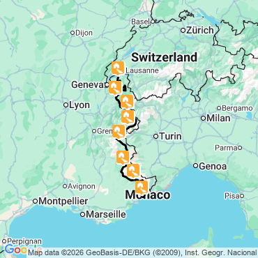 Set off from Thonon-les-Bains, on the shores of Lake Geneva, for a legendary cycling adventure: the Crossing of the Alps - a truly iconic route spanning approximately 435 miles (700 km) with a total elevation gain of 54,100 feet (16,500 m). Over seven stages, you take on the challenge of the most emblematic mountain passes of the Tour de France, including the Col de l'Iseran, Col du Galibier, Col d'Izoard, and the Cime de la Bonette. Each day unfolds through breathtaking landscapes, from dense Alpine forests and lush high-altitude meadows to the shimmering shores of the Mediterranean Sea, the ultimate reward for this remarkable achievement. From the Aravis massif to the Mercantour, via the Vanoise, this great journey on two wheels is a truly unique experience for cycling enthusiasts - a perfect blend of shared adventure, camaraderie, and a genuine taste for physical challenge