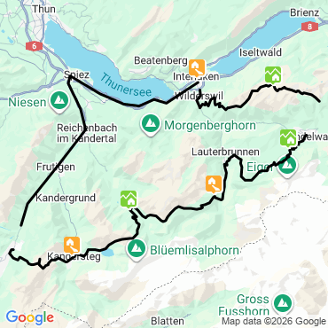 The Eiger, Mönch, and Jungfrau, or in English, the Ogre, Monk, and Maiden, form the trio of world-renowned 4000 meter peaks (well, 3967 for the Eiger) that give the Bernese Oberland its legendary reputation. These "highlands" (literally in German) form the European Alps' most massive glacier-covered sub range, bigger than the Mt. Blanc and Mt. Rose ranges combined! The many quaint alpine villages, like Grindewald and Mûrren, follow in Swiss tradition, while the surrounding mountain pastures add the finishing touch to the idyllic Swiss landscape. Traverse through the alpine meadows and valleys of the north end of the range as you take in the breathtaking panoramic views along relatively easy balcony trails.